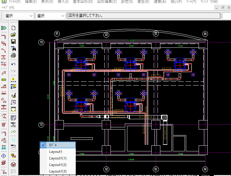 Tfasにはそもそも「レイアウト印刷」という機能がありますが、これだとページが1ページずつPDFに変換されてしまいます。今回紹介する方法は、以下の様に複数のレイアウトが存在する図面があった場合で、